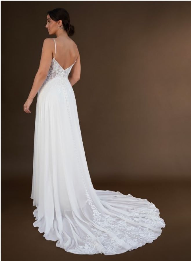 Introducing the PA 1348 Oxford Private Collection wedding dress—a stunning slim A-line gown crafted in delicate chiffon. This dress features a scooped neckline in sheer lace, accentuated by slender shoe-string straps that add an air of refined elegance. The sheer lace bodice is artfully shaped to dip along the side seams at both the front and back, creating a subtle, sophisticated detail. The chiffon skirt, cut in a slim A-line silhouette, offers graceful movement, while the back train is beautifully finished with a lace applique detail. This dress seamlessly blends modern style with timeless romance, making it the perfect choice for a bride seeking understated glamour on her special day.