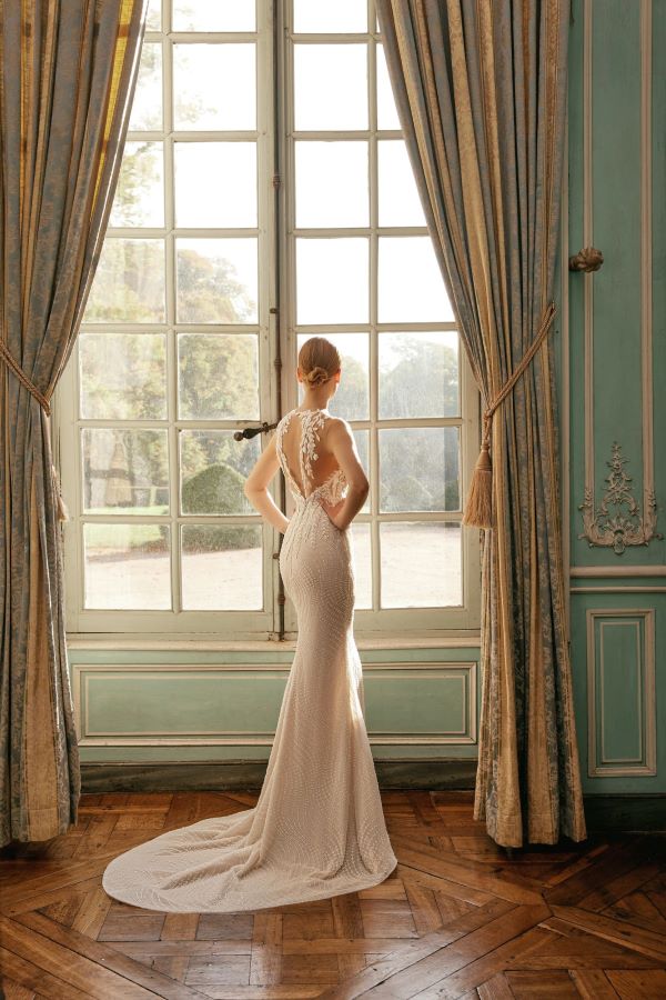 Pollardi Group Fashion - Saragossa is a sheath style wedding dress. The high neckline with deep plunge front in a small leaf design lace. The skirt is in a dainty beaded fabric in a linear wave design . This dress is perfect for the bride who wants modest with a slight sexy look . Very light in weight great for destination bride