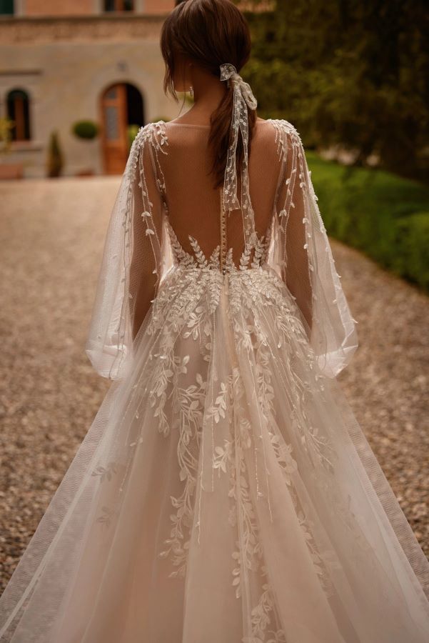 Dreamy, whimsical, romantic is just a few words that come into my mind . Long blousing sleeves wedding dress in a A-line style . Front V neckline with beaded leaf lace placed vertically on bodice cascading to soft tulle skirt . The vertical lace placement makes this wedding dress very flattering . The back is loops and buttons in nude illusion tulle with crystal buttons . The sleeves are full with a nude fitted tulle sleeve underneath